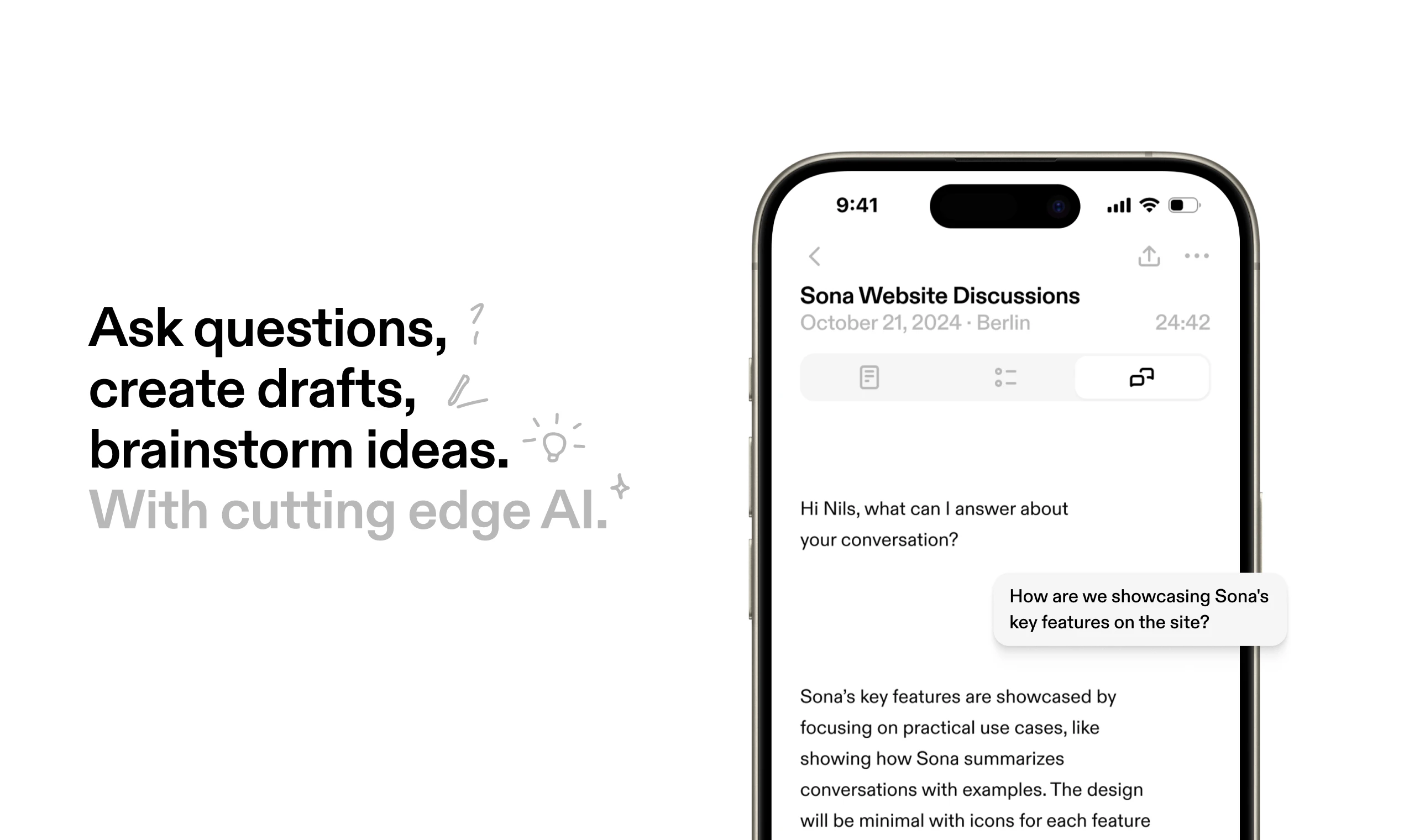 使用Sona将您的对话转化为有价值的见解。以99%的准确率录制、转录、总结并与99多种语言进行聊天。无论是会议、讲座还是采访,Sona都能帮助您掌握每一个细节。