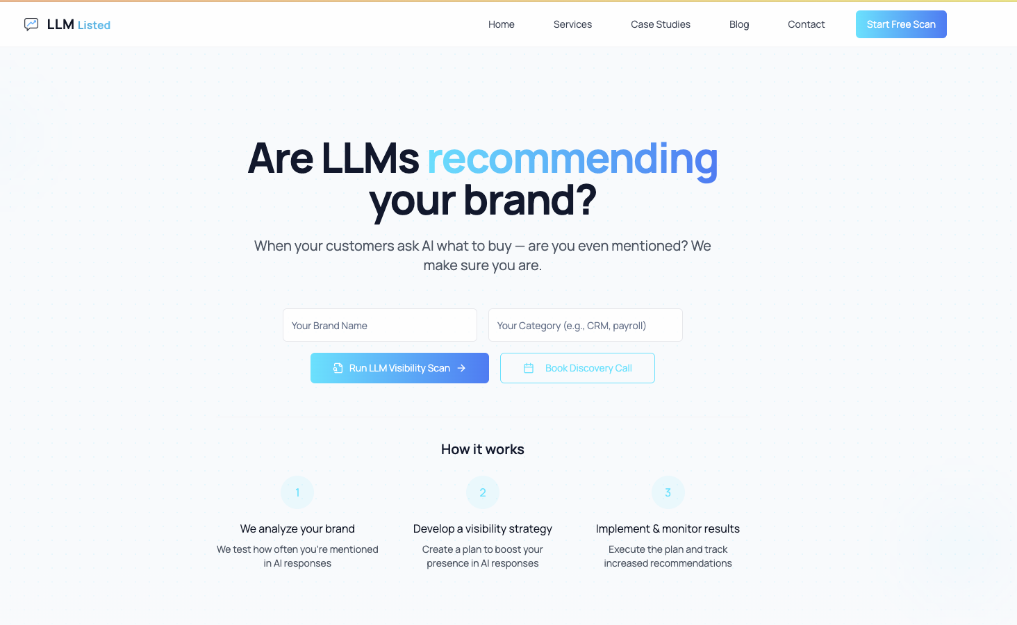 LLMListed shows if AI models like ChatGPT and Claude recommend your brand — or if you’re invisible. Run a free scan to see where you stand, who shows up instead, and what actions you can take to boost your visibility in AI-driven answers.