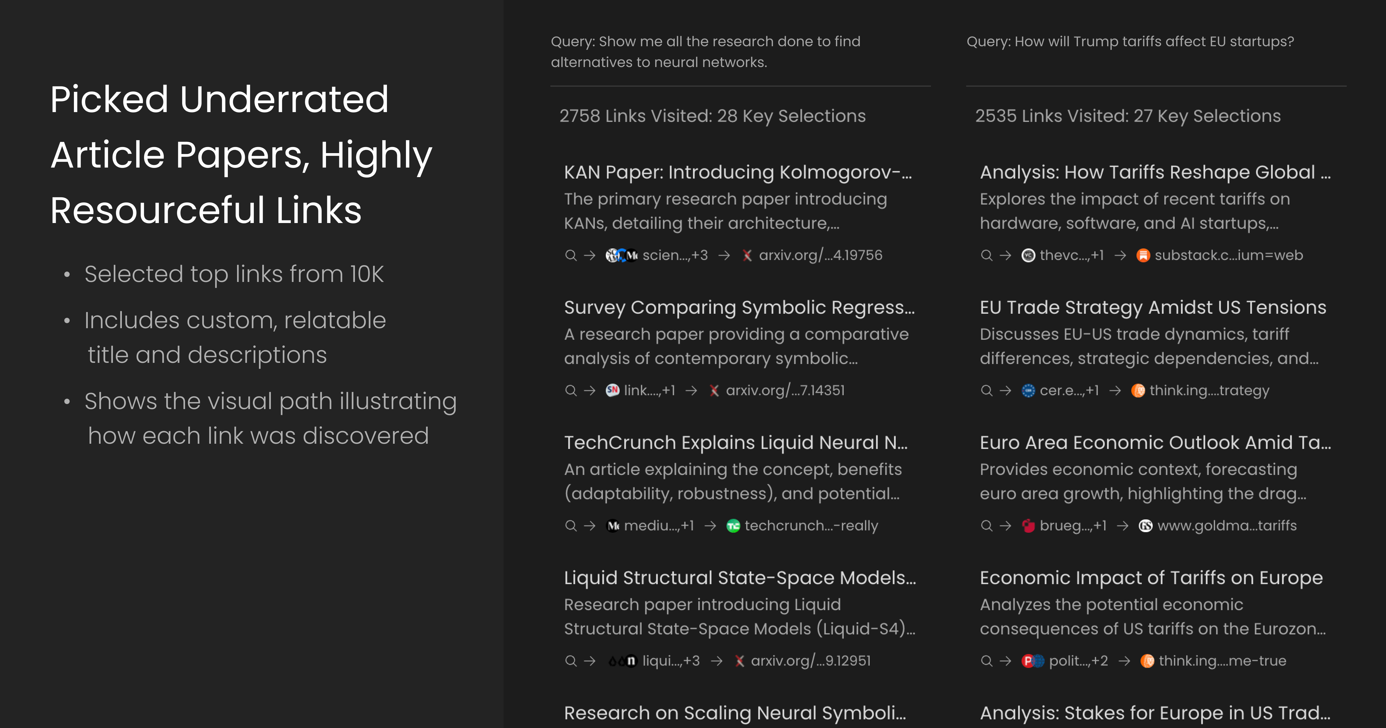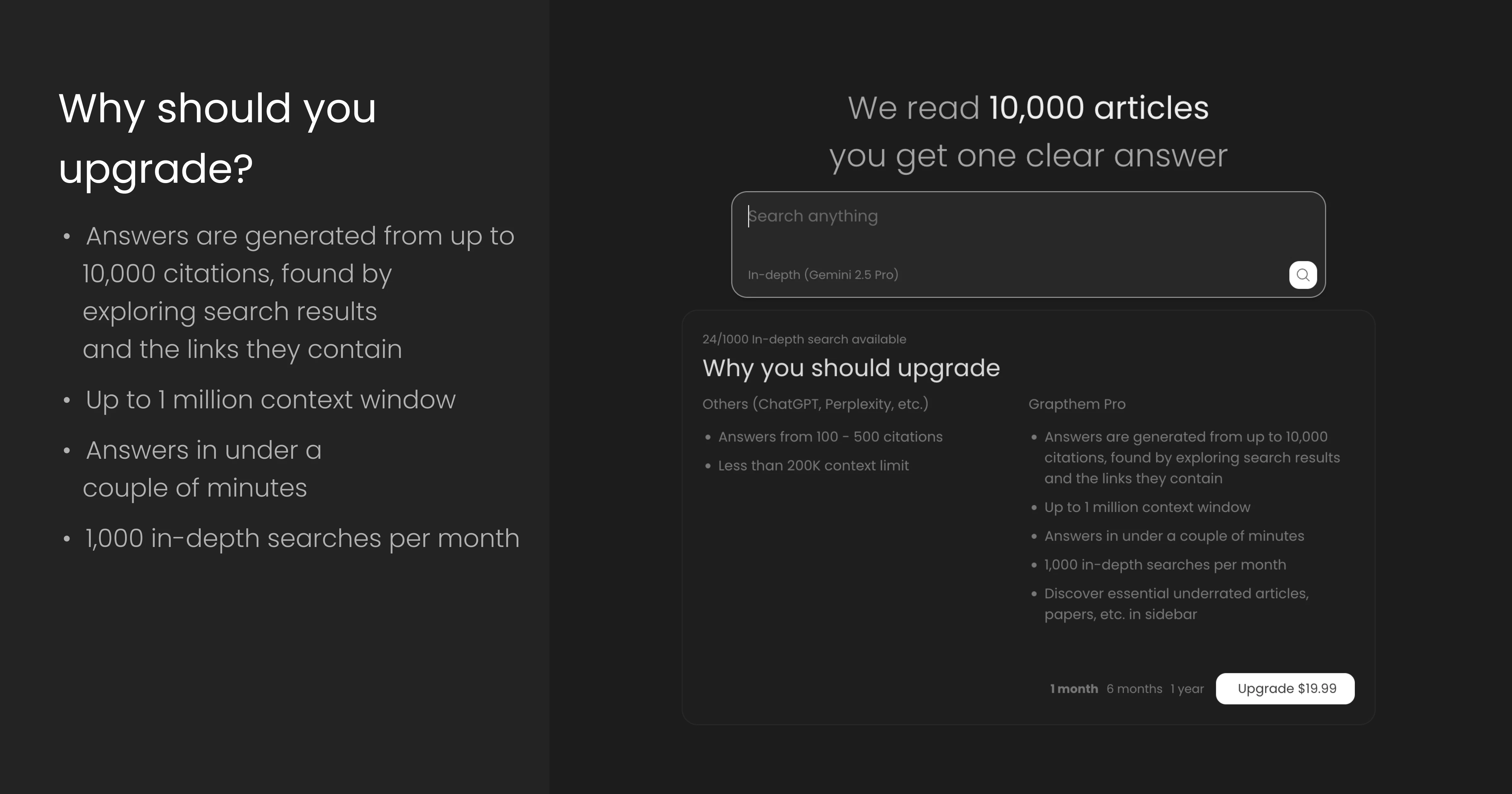 Graphthem is a deep research search engine that reads up to 10,000 articles and gives you an in-depth researched report with highly resourceful and often overlooked links. We read 10x more than any other deep research products out there.
