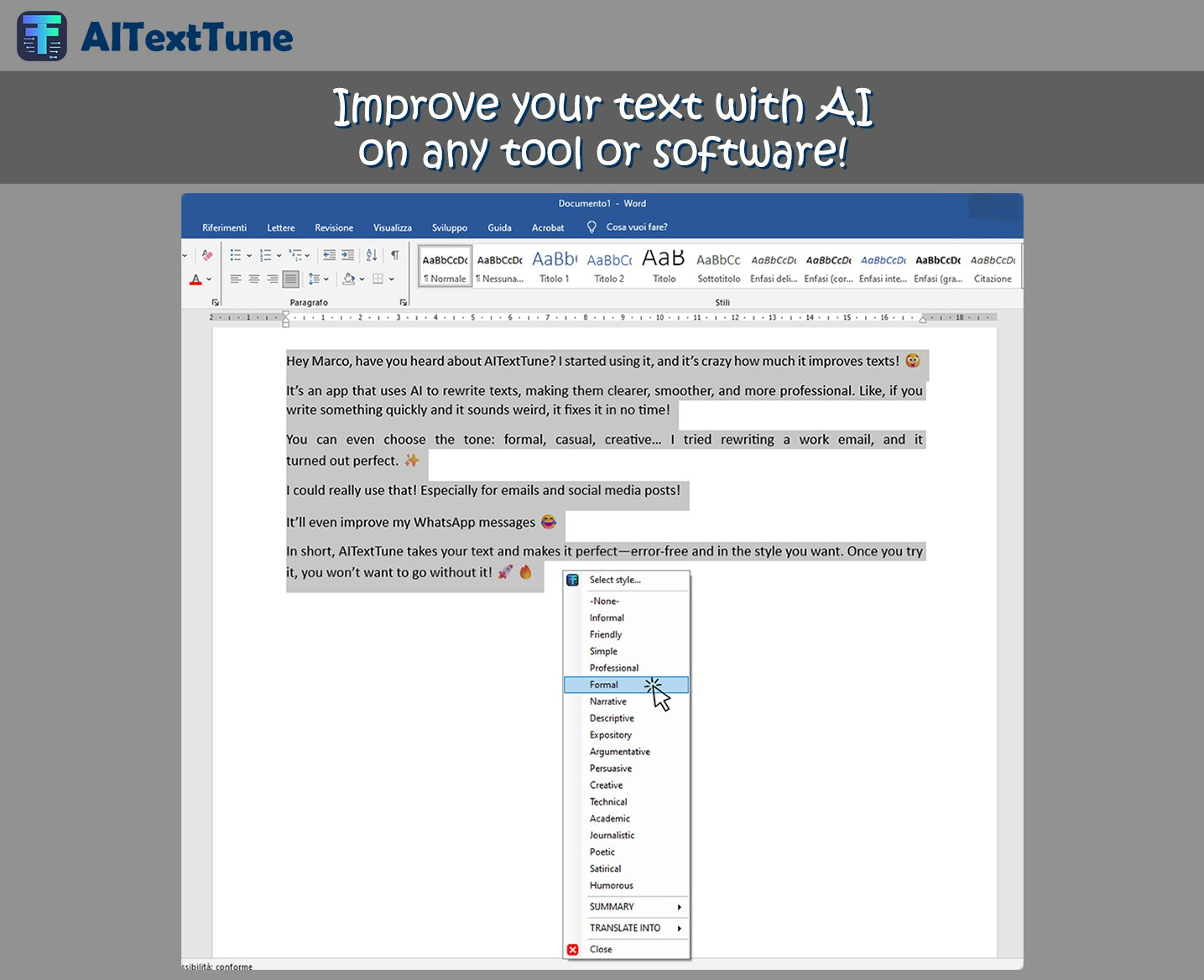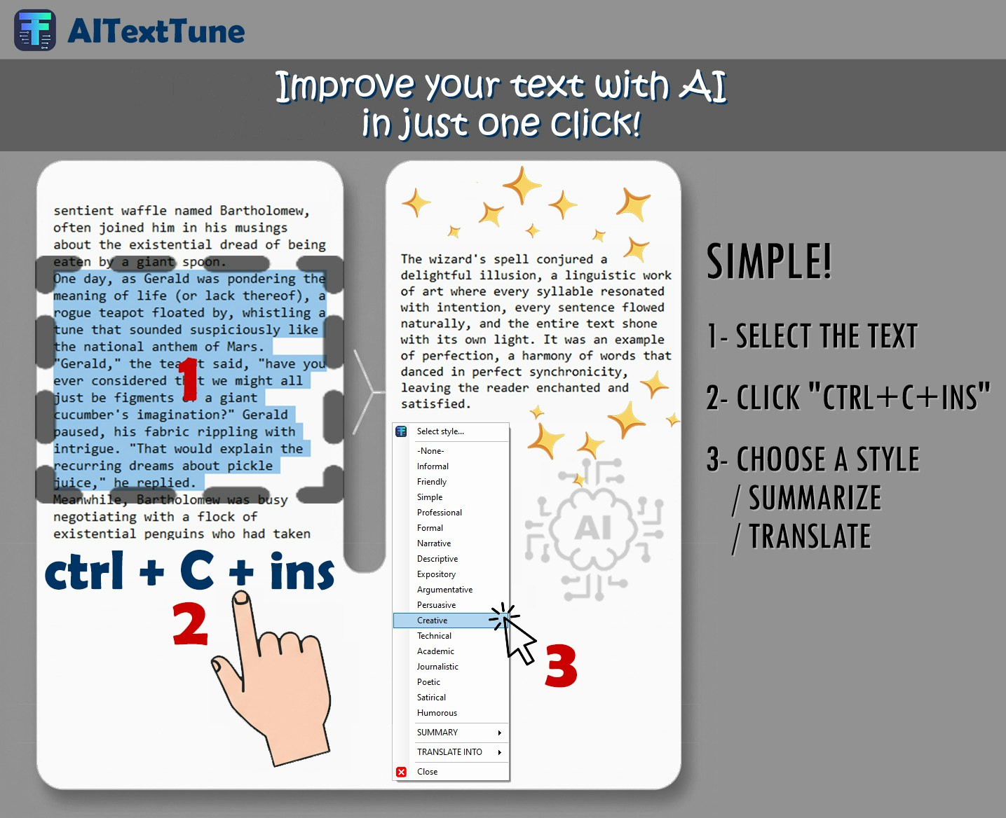 AI tool to automatically enhance writing. Correct any errors, improve clarity and flow. Choose a style and leverage AI to enhance it instantly. Generate summaries and translations in 25+ different languages. Use it on any tool or software you're writing on.