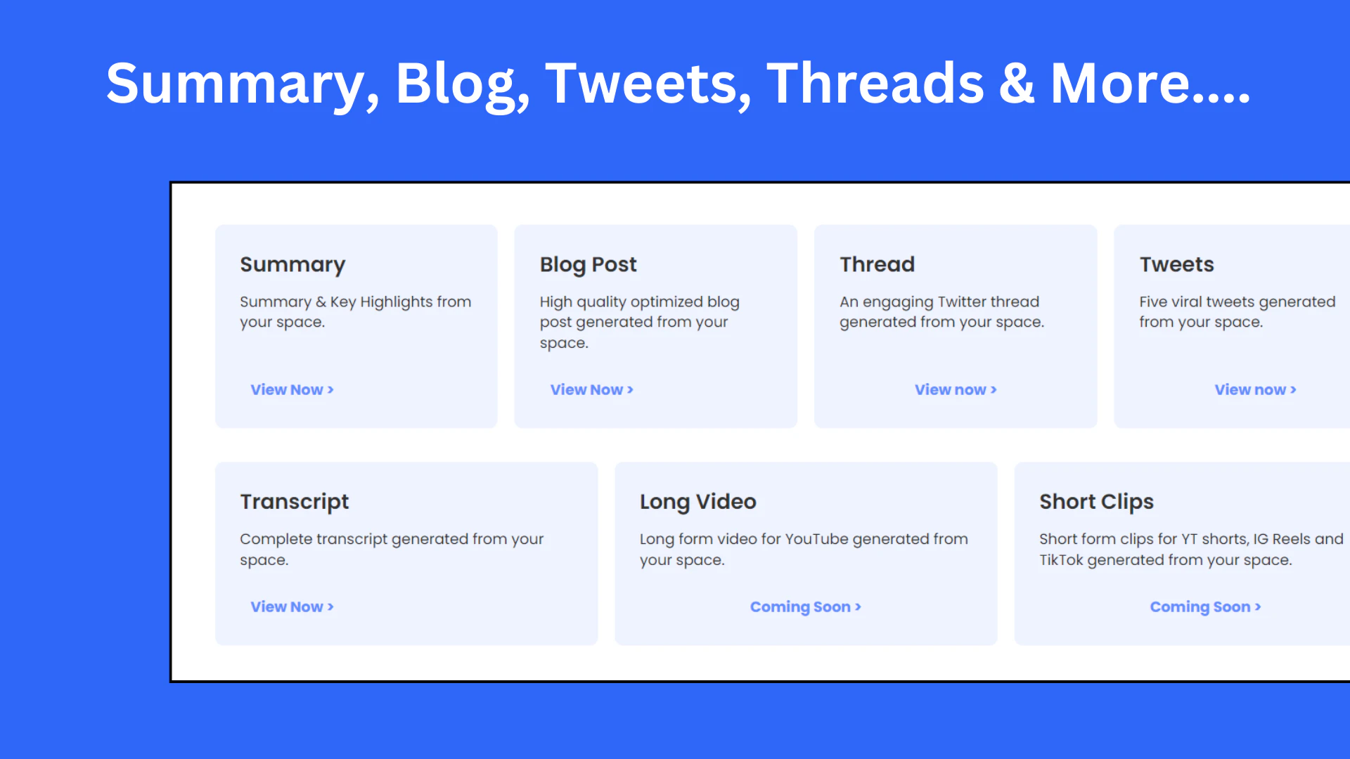 瞬间下载空间(再见,24小时等待和100步流程!),使用我们的AI生成器获取文字记录、摘要、关键亮点、博客文章、推文、主题帖等。